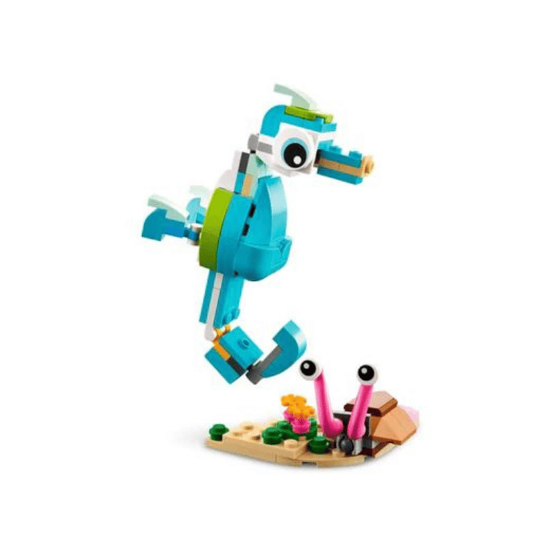 LEGO Creator 3in1 setin 3 merieläinlelun parissa riittää yllin kyllin merenalaisia hupihetkiä. Setin osista voi rakentaa liikuteltavan delfiinin ja kilpikonnan, merihevosen ja kotilon tai söpön kalan ja ravun. Tai anna luovuuden lentää ja rakenna kokonaan uusi eläin.