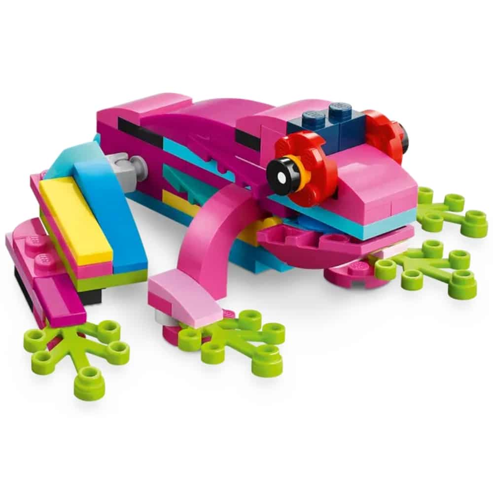 Lapset voivat rakentaa upeasta LEGO 3in1-setistä 3 erilaista eksoottista eläintä: kirkkaanvärisen papukaijan puun oksalle, leikkisän kalan uimaan meren syvyyksiin tai veikeän sammakon, joka liikuttaa jalkojaan.