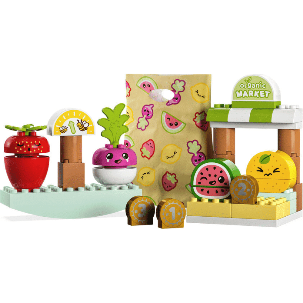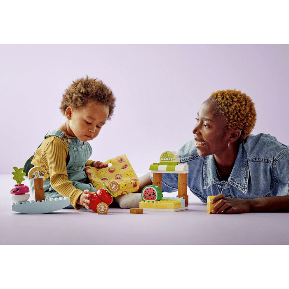 Leikki-ikäisten käsissä LEGO DUPLO lelut taipuvat loputtomiin oppimisleikkeihin, joissa itseilmaisu kehittyy ja pidetään hauskaa. Tämä setti innostaa taaperot ja aikuiset interaktiiviseen leikkiin, jossa toinen on torimyyjä hedelmä- ja vihanneskojulla ja toinen asiakas. DUPLO-leikkisettien parissa vanhemmat ja pienet lapsetpääsevät jakamaan tärkeät kehitysaskeleet yhdessä leikkien ja rakennellen.