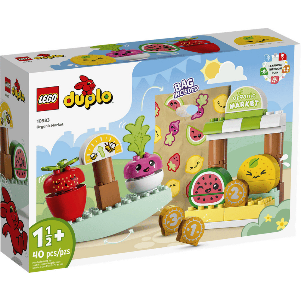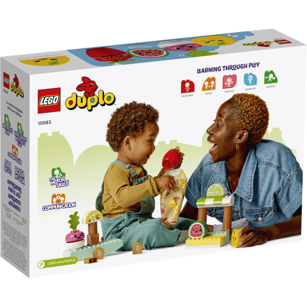 LEGO® DUPLO® Ensimmäinen luomutorini (10983) tutustuttaa pienet lapset ostamisen ja myymisen maailmaan. Suloisella torilelusetillä lapset pääsevät leikkimään arjen tapahtumia punnitessaan tuotteita vaa’alla, maksaessaan eriarvoisilla lelukolikoilla ja kantaessaan ostokset kotiin hienossa kangaskassissa.