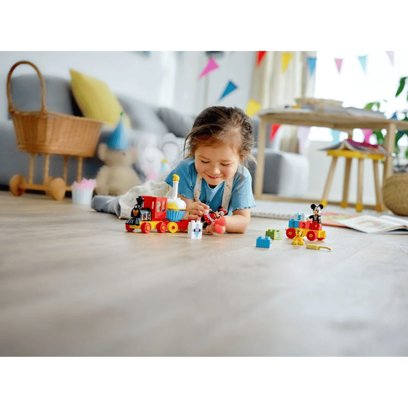 Taaperot pääsevät Disneyn Mikki Hiiren, Minni Hiiren ja Pluton seurassa syntymäpäiväjunan kyytiin. Välillä pysähdytään leikkimään, ja junan parissa opitaan vaivihkaa uusia taitoja. Värikkään rakennussarjan parissa lapset kokoavat junan ja pinoavat numeropalikoita, jolloin hienomotoriikka kehittyy. Vaunuja koristellessaan lasten luovuus puhkeaa kukkaan, ja sosiaaliset taidot kehittyvät lasten leikkiessä Disneyn herttaisilla hahmoilla.