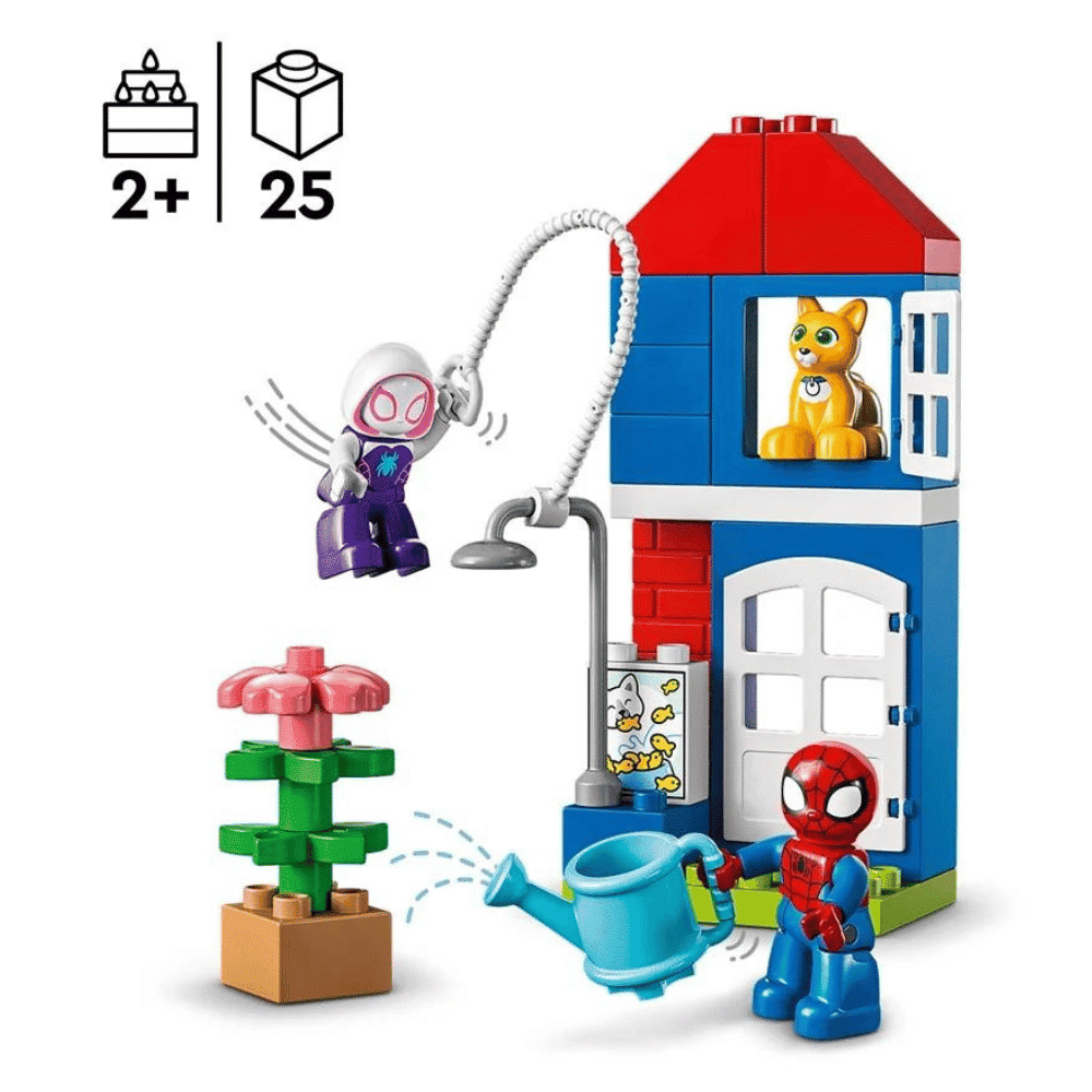 Monipuolisessa leikkisetissä on yllin kyllin kaikkea pienille Spider-Man-faneille. Setti sisältää 3 hahmoa – Hämiksen, Ghost-Spiderin ja Bootsie-kissan hahmot – sekä kasvin, joka ”kasvaa”, kun sen varteen lisää palikoita. Mukana on myös seittiosa, jonka hahmo voi sinkauttaa lyhtypylvään ympärille ihan kuin TV-sarjassa. Oven ja ikkunan voi avata helposti pienillä sormilla.
