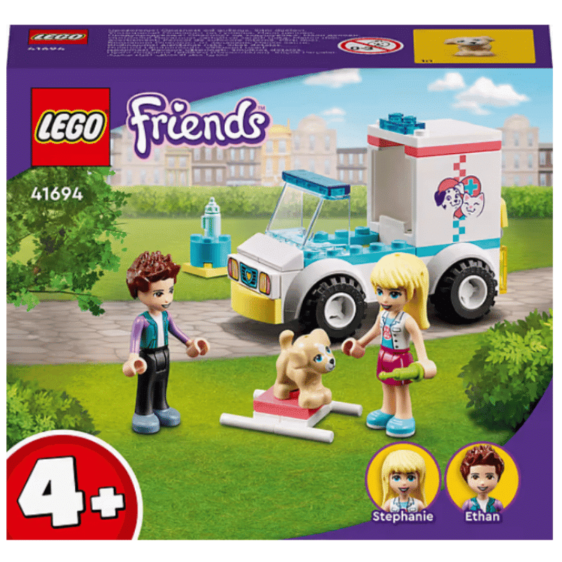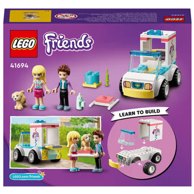 Yli 4-vuotiaat lapset pääsevät kehittämään rakennustaitojaan ja leikkimään sankarileikkejä LEGO® Friends Eläinsairaalan ambulanssi (41694) lelusetillä. Lapset pelastavat loukkaantuneen koiran ja oppivat, että ystävät pitävät aina toisistaan huolta. Söpöä ambulanssia on hauska ohjata, ja se on varustettu avautuvalla ovella, paareilla ja eläinten hoitotarvikkeilla.