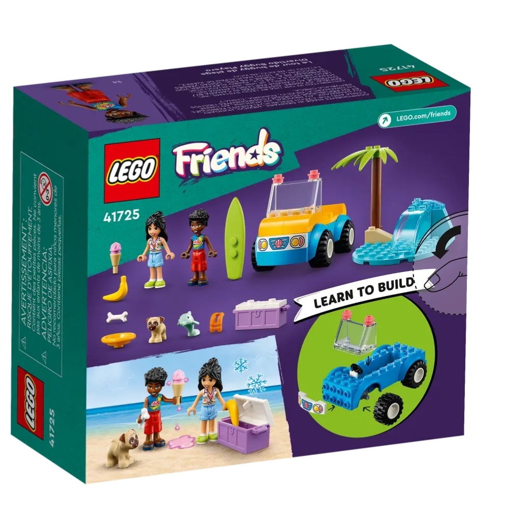 LEGO Friends 41725 Huvittelua rantakirpulla rakennussetti innostaa rantaleikeistä pitävät, yli 4-vuotiaat lapset luovien tarinoiden pariin. Setin rakentelun lomassa lapset tutustuvat Liann‑ ja Zac-hahmoihin. Energinen ja innokas Liann on täydellinen ystävä seuralliselle Zacille. Setti sisältää tarvikkeita, kuten kylmälaukun, banaanin ja jäätelön. Mukana on myös rantakirppu ja aaltoa esittävä rakennelma sekä mopsin ja delfiinin hahmot.