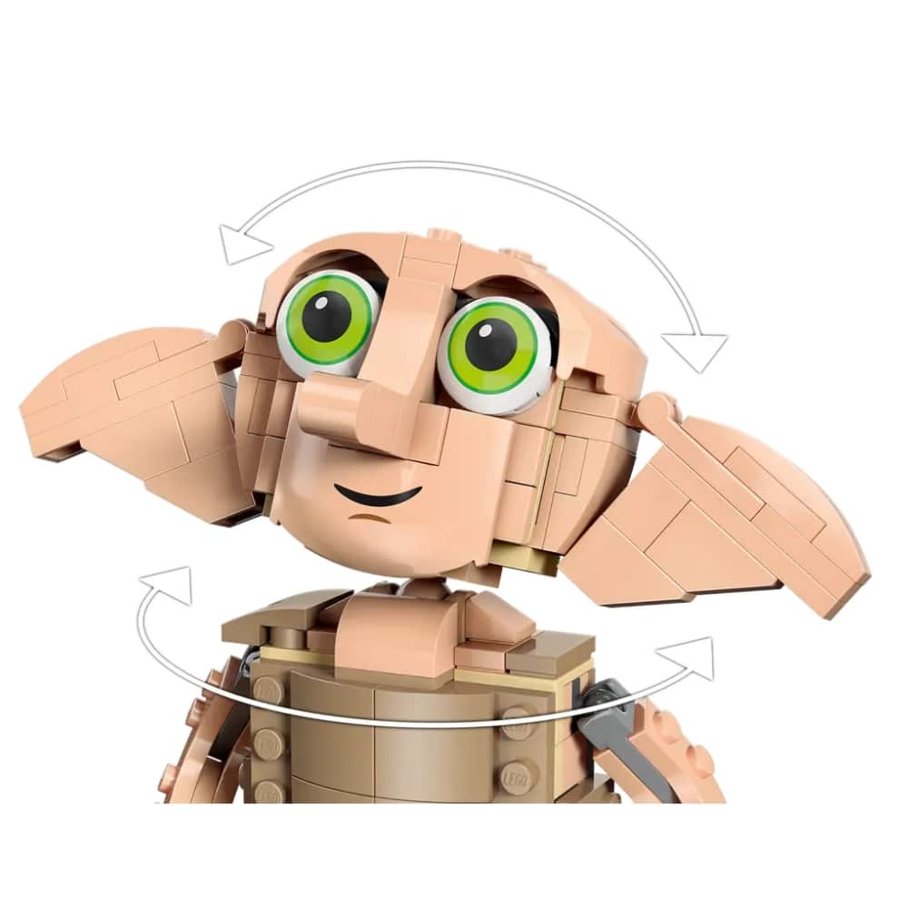 - Kääntyvä pää, korvat, käsivarret ja sormet – Vaihda Dobbyn ilmettä ja kääntele sormia, jotta se voi pidellä palikoista rakennettavia tarvikkeita