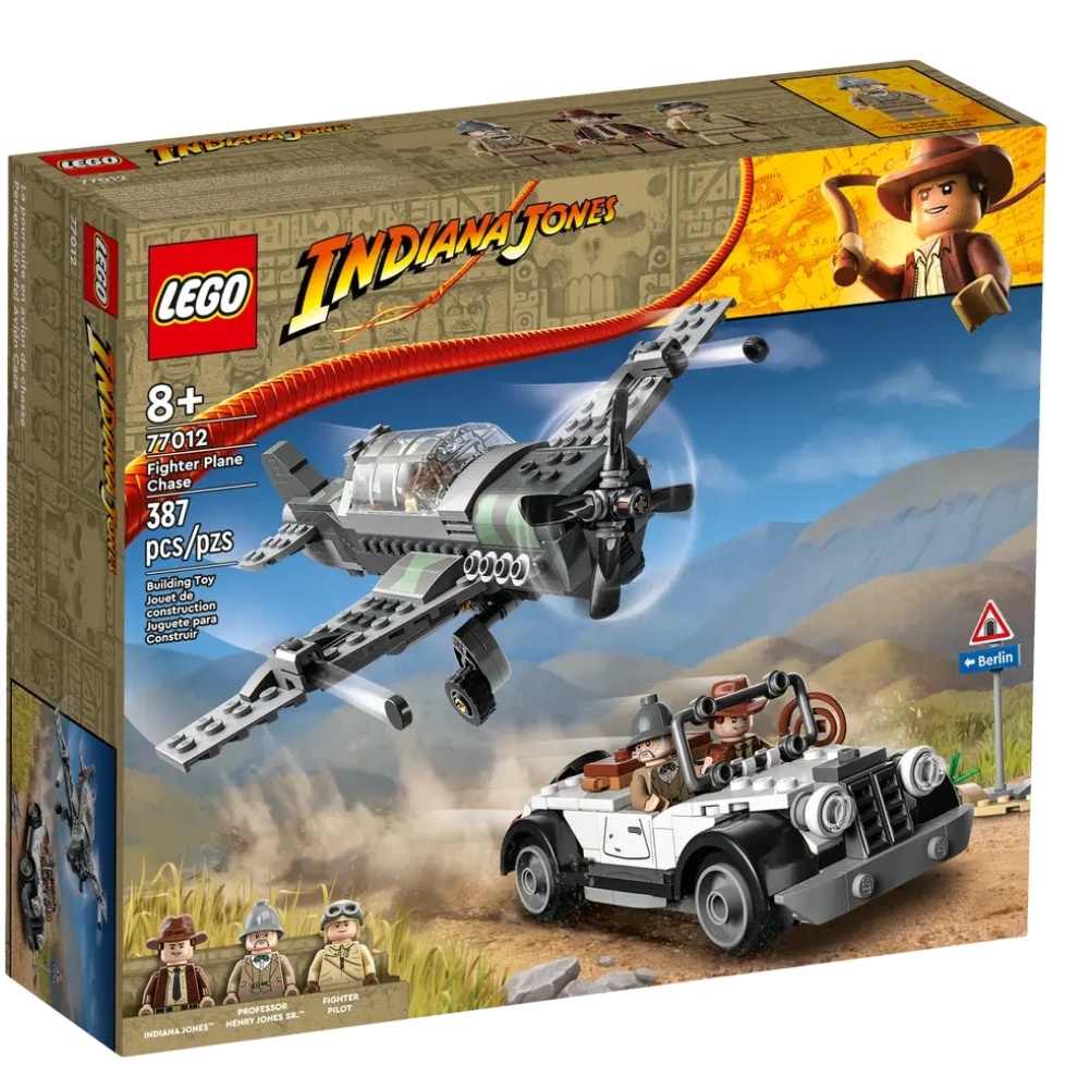 LEGO Indiana Jones 77012 Hävittäjälentokoneen hyökkäys setti sisältää kaiken tarvittavan yli 8-vuotiaiden lasten tuntikausien luoviin leikkeihin. Mukana on propelleilla, 2 nuppipyssyllä ja irrotettavilla siivillä varustettu upea hävittäjälentokone sekä huippuhieno vanha avoauto, jonka takana olevasta arkusta löytyy sateenvarjo ja pistooli.
