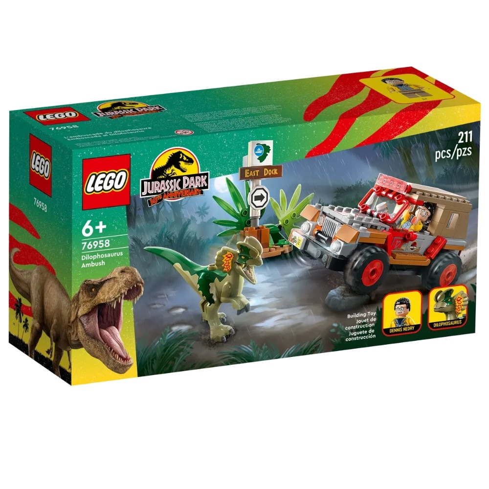 LEGO Jurassic Park 76958 Dilophosauruksen väijytys lelusetti innostaa lapset rakentamaan Jurassic Park ‑elokuvasta tutun kohtauksen, uppoutumaan mielikuvitusleikkeihin ja keksimään ikiomia tarinoita. Yli 6-vuotiaille sopiva upea setti sisältää Dilophosaurus-hahmon sekä rakennettavan Jurassic Park Jeep® ‑maasturin, jossa on paikka Dennis Nedryn minihahmolle. Mukana myös Barbasol-purkki, mutainen minihahmo, dinosauruksen jalanjälki ja pieni viidakkorakennelma East Dock ‑kyltteineen, jonka maasturi voi kaataa kumoon ihan kuin elokuvassa.