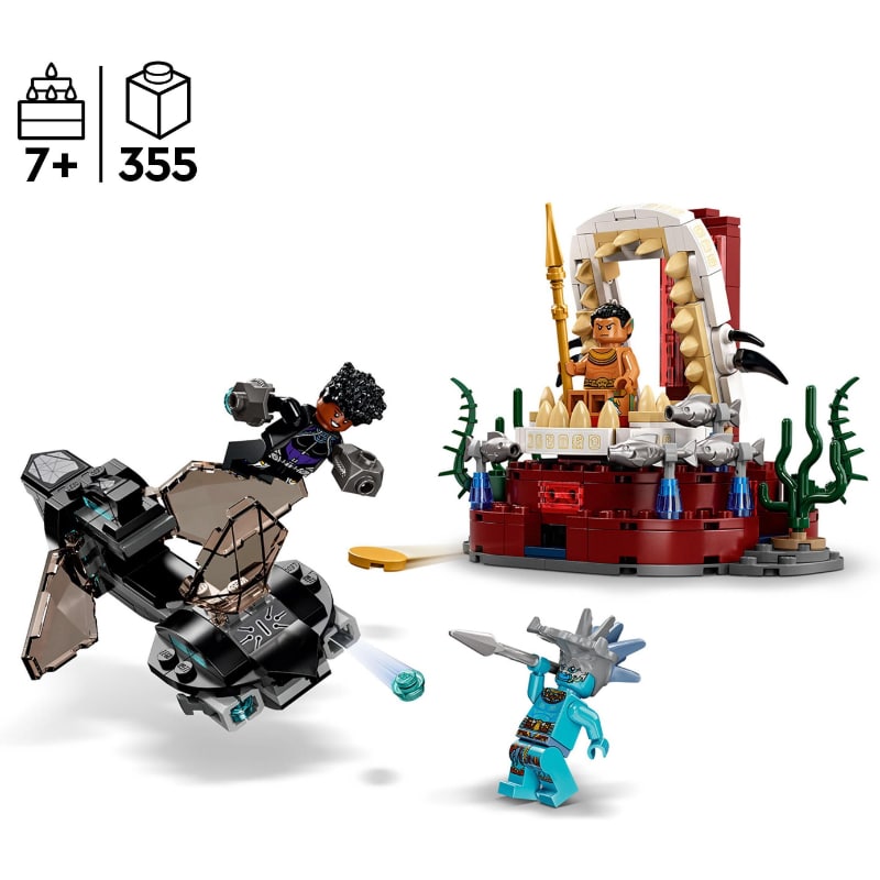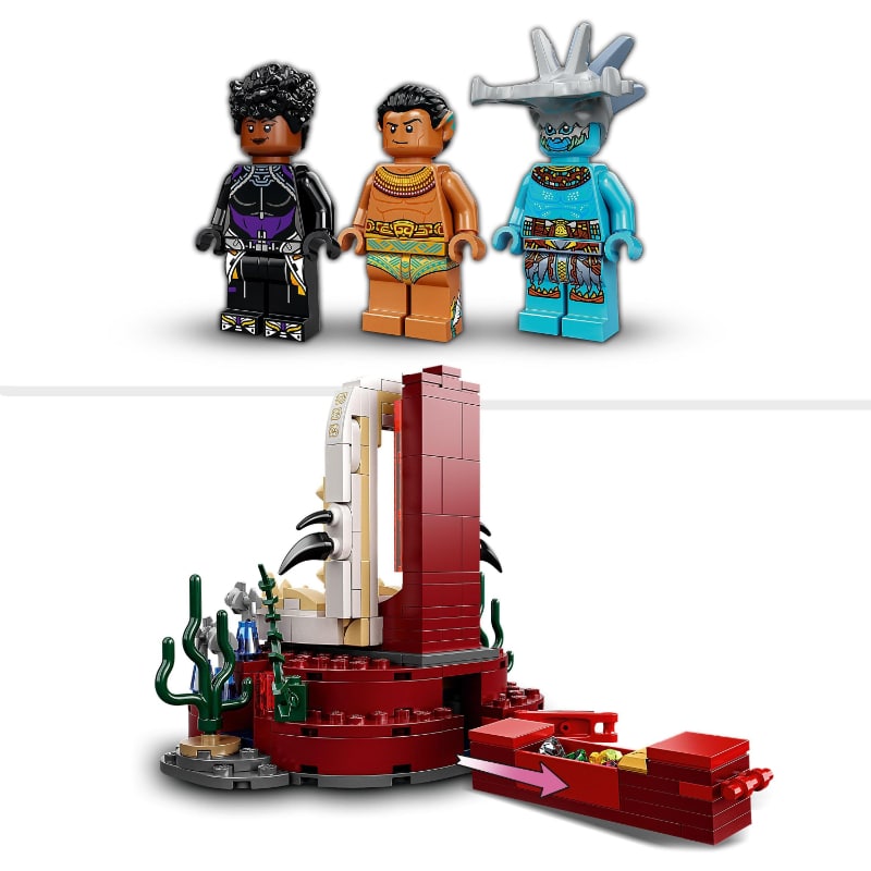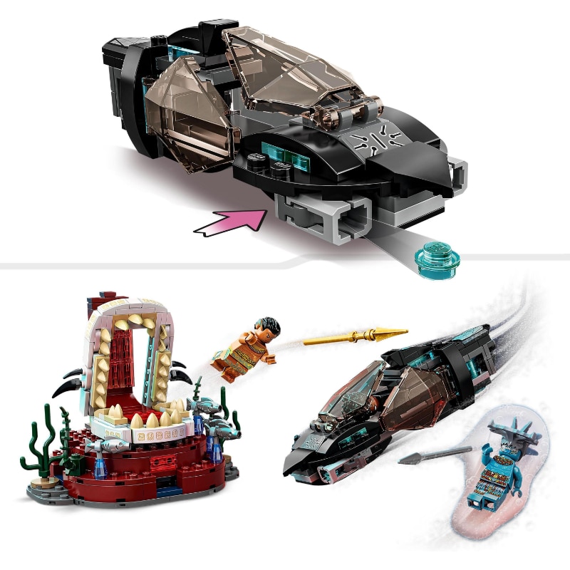 Tyylikäs versio Marvel-elokuvassa Black Panther: Wakanda Forever tutusta Skirmisher-sukellusveneestä, jossa on nuppiaseet taisteluun Attuma-pahista vastaan. Sukellusveneen matkan päätteeksi saavutaan kuningas Namorin palatsiin, josta löytyy merilevällä koristettu valtaistuinsali. Kun tehtävä on suoritettu, on aika palata sukellusveneelle ja kohti seuraavia vedenalaisia seikkailuja. Setissä on 3 minihahmoa: Shuri, Attuma ja kuningas Namor, joilla on upeat aseet ja tarvikkeet.