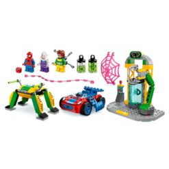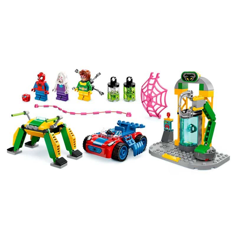 - Täynnä osia, jotka käynnistävät leikin – LEGO® Marvel Spidey And His Amazing Friends Spider-Man Tohtori Mustekalan labrassa (10783) sisältää 3 minihahmoa, robottihämähäkin, labran, rakennettavan auton ja robottipuvun