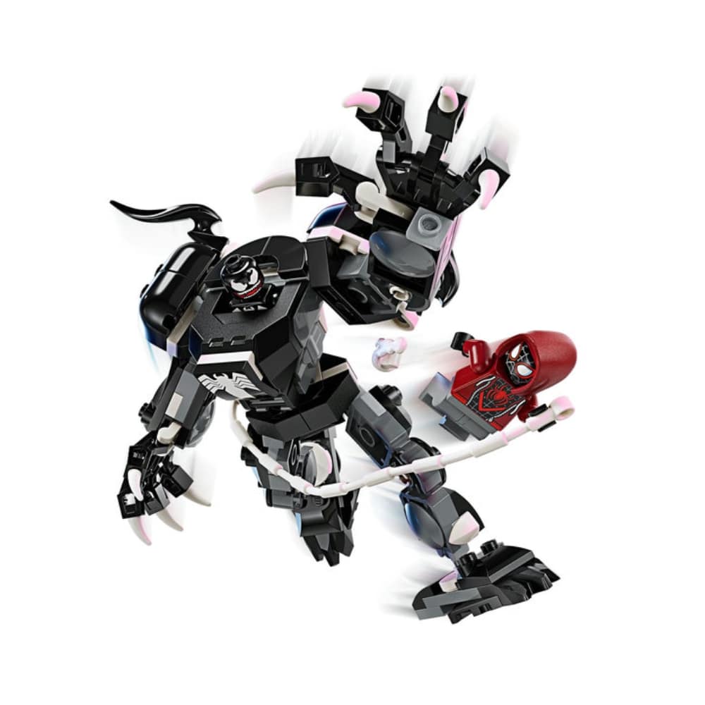 Rakennettavan Venom-robotin käsiä ja jalkoja voi taivutella, ja hahmon sormet ovat niin suuret, että niihin voi helposti napata minihahmon. Robotin rintakehässä on ohjaamo Venom-minihahmoa varten. Setti sisältää myös Miles Moralesin minihahmon, jolla on varusteena käsissä pideltävät 2 seitinheitintä ja taipuisa seittiköysi, jonka voi kiinnittää Venom-robottilelun eri kohtiin.
