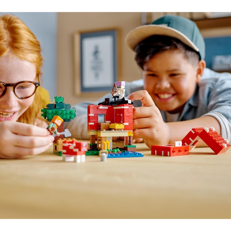Minecraft-pelaajat pääsevät kokeilemaan, miltä tuntuu rakentaa sienitaloa ihan oikeasti. Talon katon ja seinät voi nostaa pois, joten rakentelupöytää ja huonekaluja on helppo käyttää. Ulkona Minecraft-sankari Alex hakee kulholla sienimuhennosta sienilehmältä. Suunnitelmat saavat uuden käänteen, kun hämähäkkiratsastaja rynnistää paikalle. Loputtomasti mahdollisuuksia mielikuvitusleikkiin, kun Minecraftin sienitalo on lasten leikeissä.