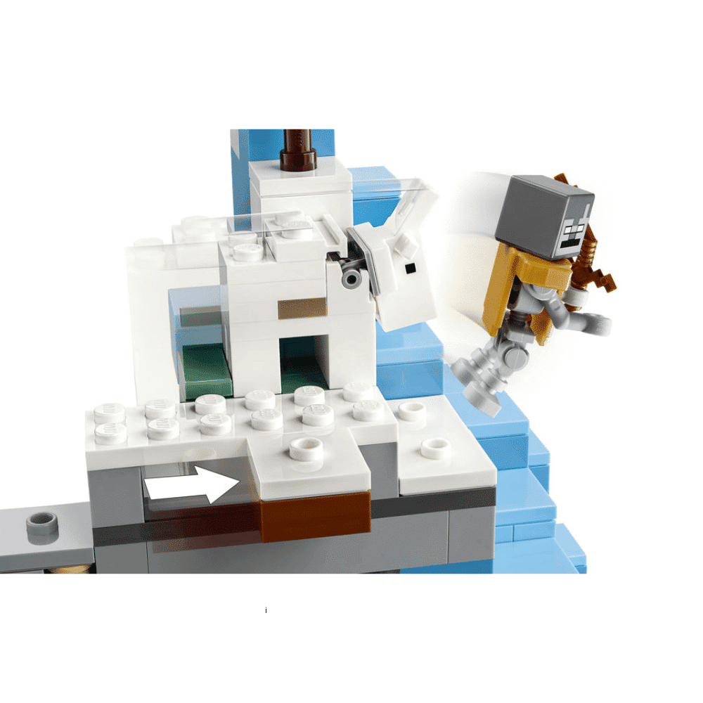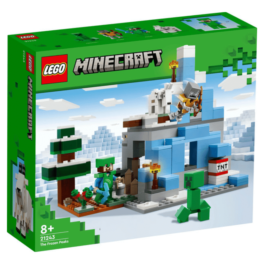 LEGO Minecraft 21243 jään peittämät huiput setti on täynnä konkreettisia yksityiskohtia ja toimintoja, joiden parissa 8 vuotta täyttäneet pelaajat saavat yllin kyllin vauhdikkaita Minecraft-hupihetkiä.