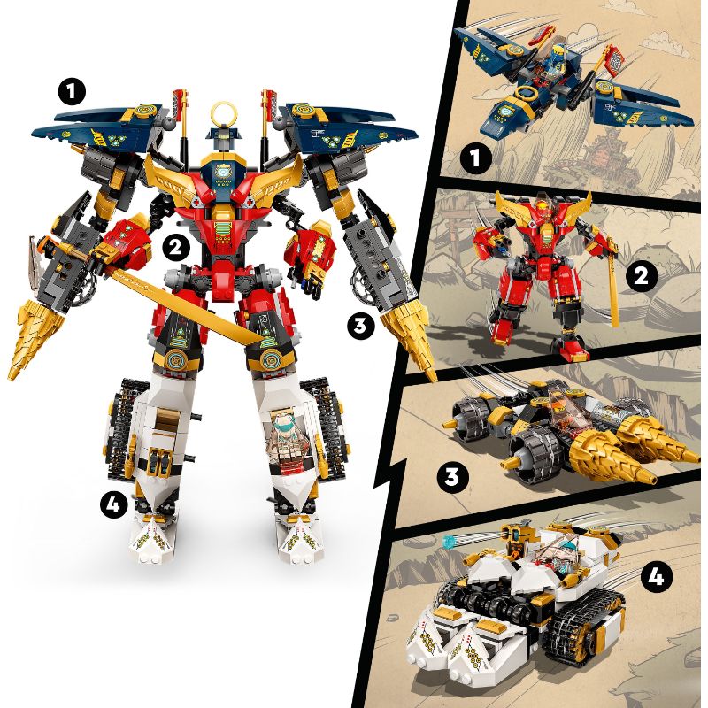 Yli 9-vuotiaat lapset innostuvat uppoutumaan tuntikausiksi jännittäviin ninjaseikkailuihin Ninjojen ultrayhdistelmärobotin (71765) ja sen neljän ajoneuvon parissa. Robottilelu on ultimaattinen taistelukone, ja sen robotilla, autolla, tankilla ja suihkarilla voi leikkiä kaikilla erikseen.