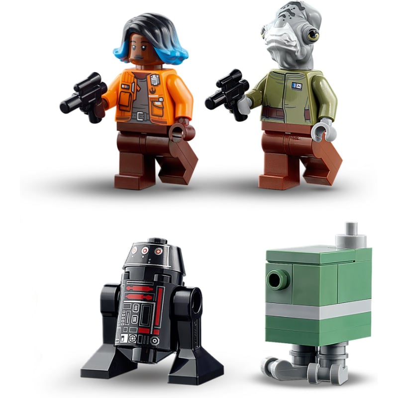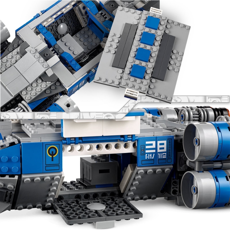 - Kuljetusaluksen yläosa nousee ja sivut avautuvat, joten voit leikkiä hahmoilla myös aluksen sisällä. Kuljetusaluksessa on ohjaamo LEGO® minihahmolle, ruuma, jossa on tilaa droideille sekä neljä kääntyvää nuppipyssyä ja aluksen perässä neljä nuppipyssyä valmiina taisteluun