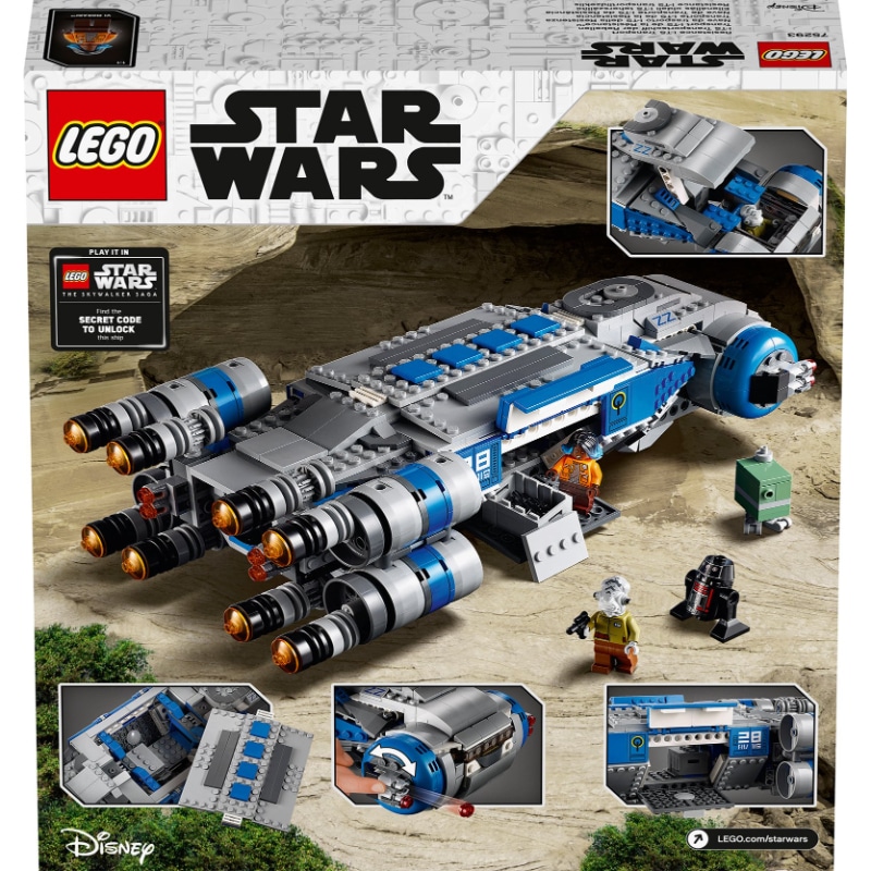 - Koe Disneyn Star Wars™ -teemapuiston Galaxy’s Edgen jännitys LEGO® tyyliin tämän fantastisen LEGO Star Wars Vastarinnan I-TS-kuljetusalus (75293) rakennuslelun parissa.
