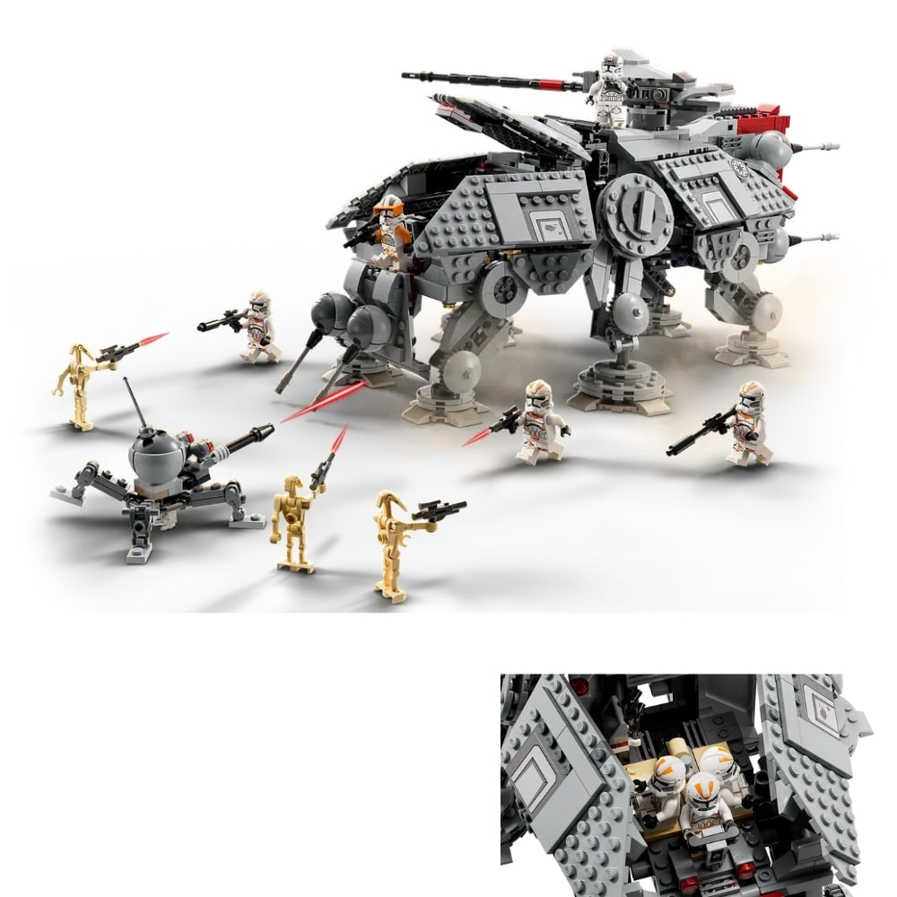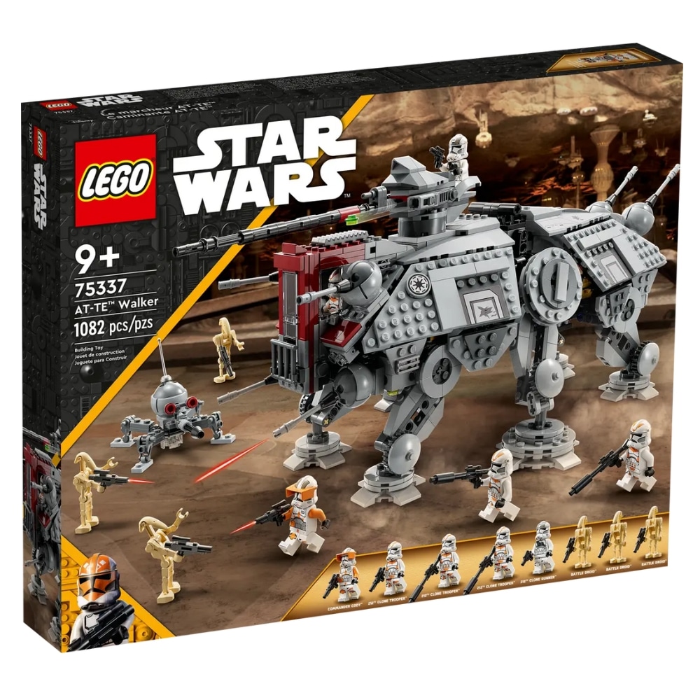 LEGO Star Wars 75337 AT-TE-talsija – Talsijalla on taipuisat jalat, 2 pyssyllä varustettu liikkuva sädetykki, irrotettava ohjaamo ja 2 hyttiä. Setti sisältää 5 minihahmoa ja 3 taisteludroidihahmoa ja rakennettavia kääpiökokoisia hämähäkkidroideja, sekä paljon hienoja aseita. Valmis rakennelma on 19cm x 44cm x 24cm ja sisältää 1082 osaa. Ikäsuositus: 9+ vuotta.