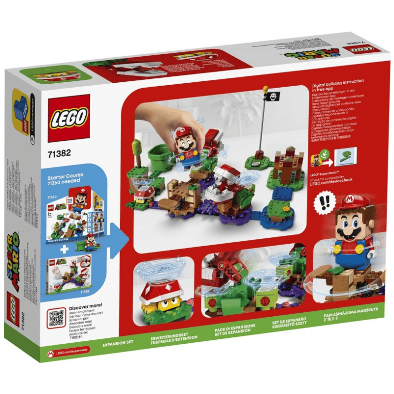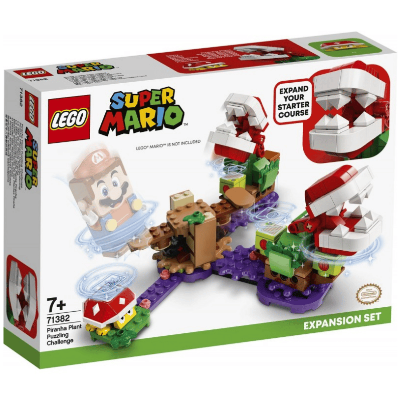 Laajenna LEGO® Super Mario™ maailmaa hauskempiin leikkeihin yksin tai ystävien kanssa Piraijakasvin pulmallinen haaste -laajennussarjalla (71382). Siinä on 2 piraijakasvia ja Spiny-hahmo LEGO® Marion™ (setti ei sisällä hahmoa) voitettavaksi. Pyörivällä karusellilla voi raivata pois tieltä piraijakasvit, jotta pelaaja pääsee kolmelle punaisten kolikoiden kuutiolle, joista saa suuria digikolikkopalkintoja. (Huomio: Aloitusrata-setti 71360 tarvitaan interaktiiviseen pelaamiseen.)