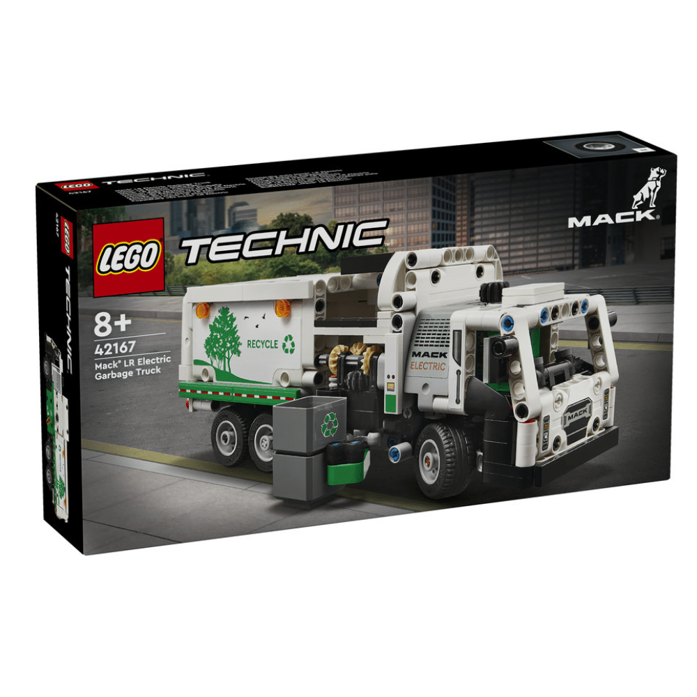 LEGO® Technic Mack® LR Electric Jäteauto (42166) innostaa yli 8-vuotiaat ajoneuvoista pitävät pojat ja tytöt pohtimaan vihreän energian merkitystä ja pitämään kaupungin puhtaana. Kierrätyskuorma-autolelun inspiraation lähteenä on uusinta tekniikkaa edustava ja sähköllä toimiva Mack-jäteauto toimintoineen ja mekanismeineen.