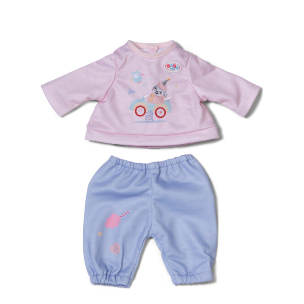 Settiin kuuluu pehmeä vaaleanpunainen paita ja rennot violetit housut. Helppokäyttöisen mallin ansiosta pienetkin lapset voivat pukea nukkensa itsenäisesti.