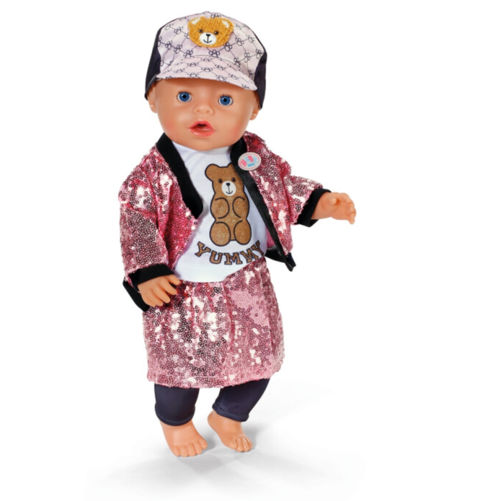 Tämä asu tekee Baby Born -nukesta glamourin kuningattaren! Mustien leggingsien ja nallepaidan päälle puetaan hame ja takki – molemmissa on vaaleanpunaisia paljetteja. Tämän siistin asun viimeistelee lippis, jossa on suloiset nallen kasvot.
