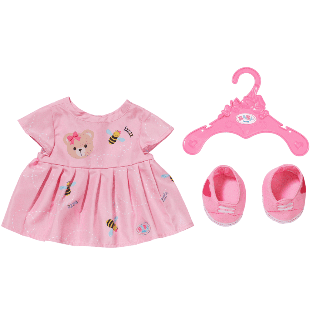 Suloinen vaaleanpunainen Baby Born asu nalle mekko ja tossut sopii sekä 36 cm kokoiselle BABY born-nukelle että BABY born nallekarhulle. Mekossa on nallen ja mehiläisen kuvia ja takana avattava tarranauhakiinnitys. Mukana tulee pieni muovihenkari. Ikäsuositus: yli vuoden ikäisille lapsille.
