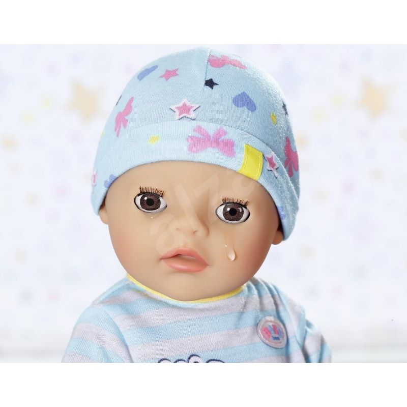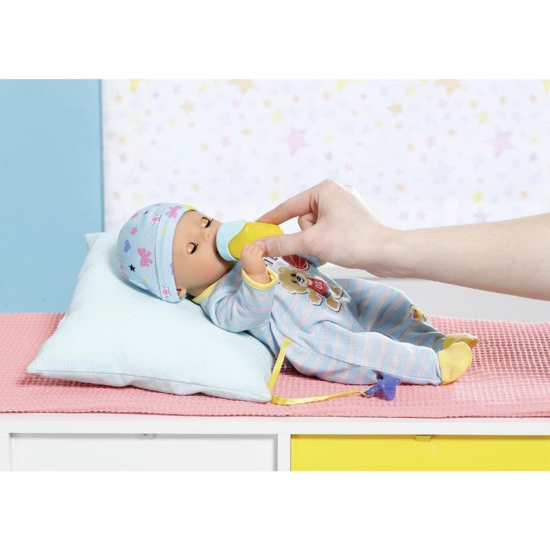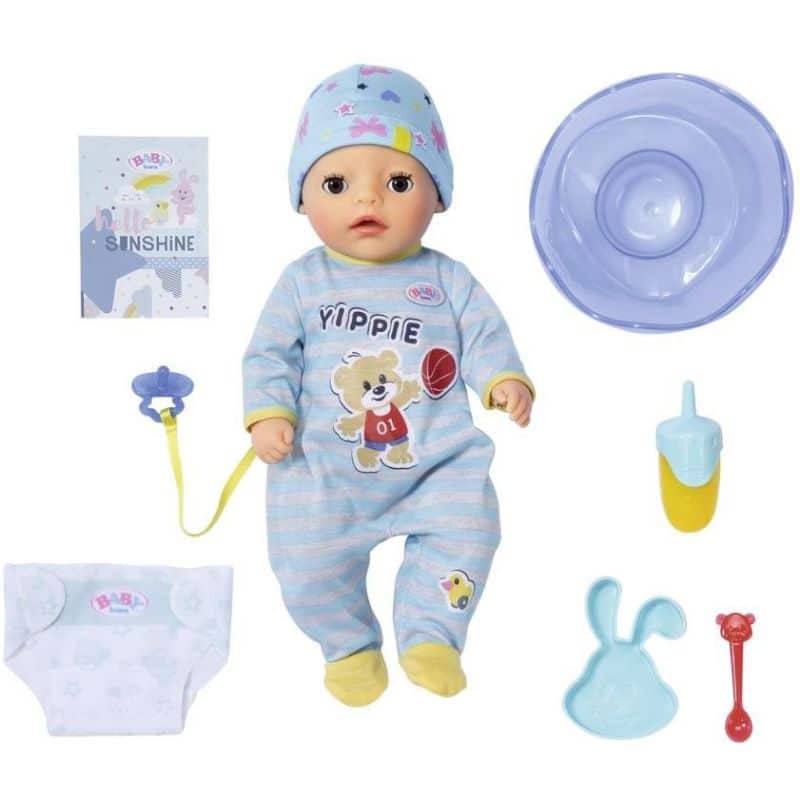 Baby Born poika nukke suloisessa harmaa-sininen potkupuvussa ja pipossa. Pakkaus sisältää potan, vaipan, maitopullon, lusikan ja lautasen, tutin ja syntymätodistuksen. Nukke pystyy juomaan vettä, itkemään kyyneliä, käyttämään pottaa, kylpemään sekä nukkumaan.