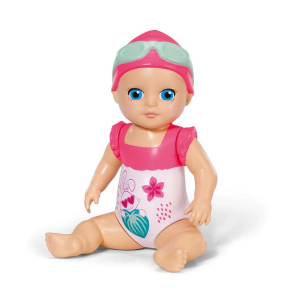 Emma-nukella on käsissään wind up -toiminto, jonka avulla se ui. Nukella on päällään hauska uima-asu. Iloa kylpyhetkiin!