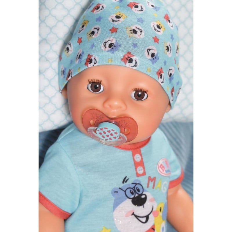Sisältää: Baby Born Magic Boy nukke, tutti, puuropussi, kulho, lusikka, tuttipullo, vaipat, potta, syntymätodistus ja kaula- ja rannekoru.