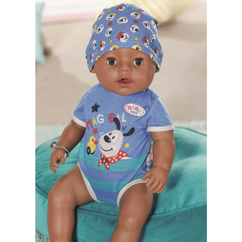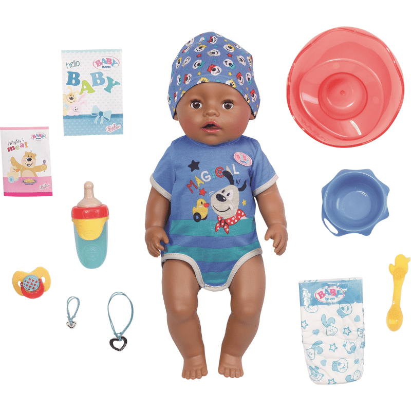 Sisältää: Baby Born Magic -poikanuken, body ja hattu, potta, vaippa, ruokalautanen, lusikka, annospuuro, tuttipullo, taikatutti, syntymätodistus, ystäväranneke nukelle ja lapselle