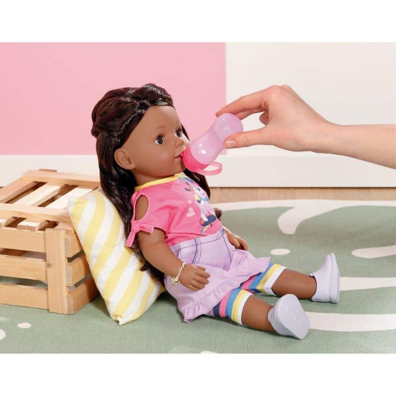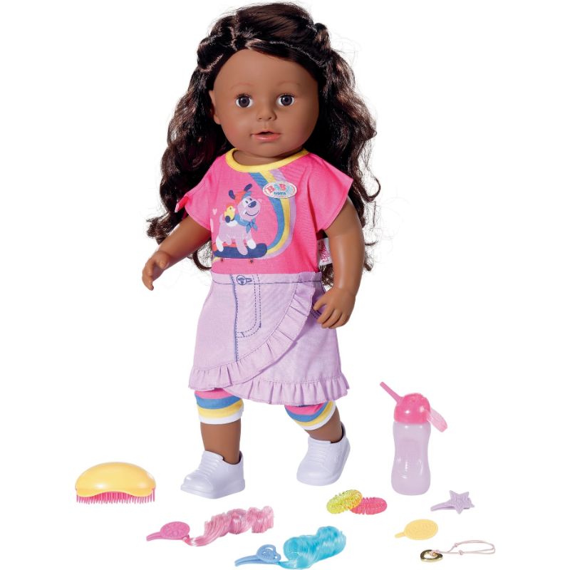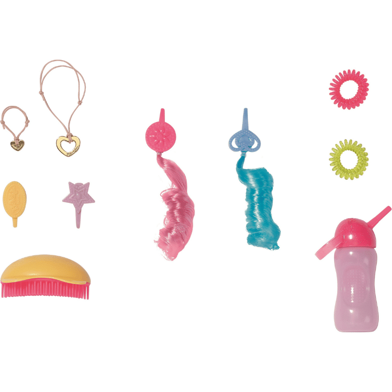 Baby Born Sister -nukke rakastaa kampaamoleikkejä! 43 cm kokoisella nukella on upeat ruskeat hiukset, joita on kiva harjata ja niihin on kiva laittaa näyttäviä kampauksia. Mukana erivärisiä hiuksia, jotka sopivat ruskeisiin hiuksiin täydellisesti. Ole kuitenkin varovainen, ettet käsittele nuken hiuksia liian lujasti, sillä se saattaa alkaa itkemään. Pakkauksessa mukana juomapullo, hiusharja, hiusklipsejä, hiustatuointeja, irtohiuskoristeita ja hiuslenkkejä, sekä suloiset rannekorut nukelle ja leikkijälle. Nukke osaa juoda ja itkeä oikeita nuken kyyneleitä. Ei vaadi toimiakseen paristoja!