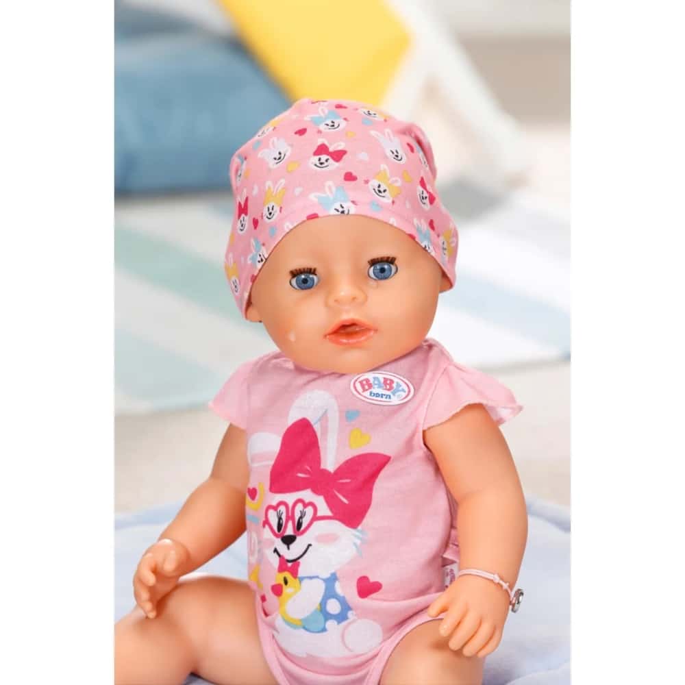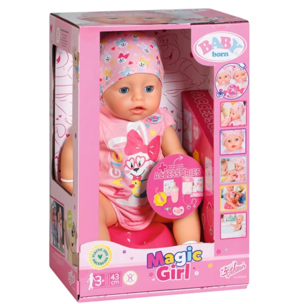 Koe taika Baby Born nukke tyttö Magic 43 cm kanssa! Tämä lumoava nukke on täydellinen leikkikaveri ja hoidettava lapsellesi. Vauvanukke sulkee silmänsä taianomaisesti tuttia suussa pyörittämällä. Nukkea voi kylvettää, juottaa ja se itkee oikeita kyyneleitä ja pissaa. Se on ihan kuin oikea vauva. Upeilla ominaisuuksilla tämä nukke vie leikkimisen aivan uudelle tasolle. Baby Born Magic-nukke on varustettu taikapallolla, joka muuttaa väriä, kun sen laittaa kuumaan tai kylmään veteen. Lapsesi rakastaa nähdä nuken muuttuvan silmiensä edessä.