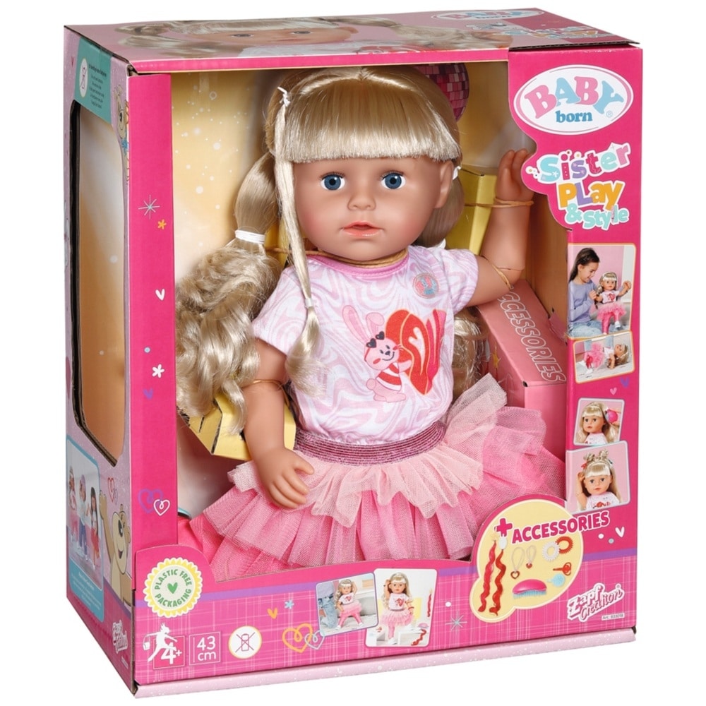 Baby Born nukke vaalea sisko on vanhempi kuin BABY born, mutta yhtä pitkä, joten he voivat käyttää samoja vaatteita. Nukella on ihanan pitkät hiukset, joihin voit tehdä upeita kampauksia. Nukke on myös taipuisampi kuin nuket yleensä, joten voit venytellä sen kanssa eri asentoihin. Kun nukelle tulee hiki, kylvetä nukkea.