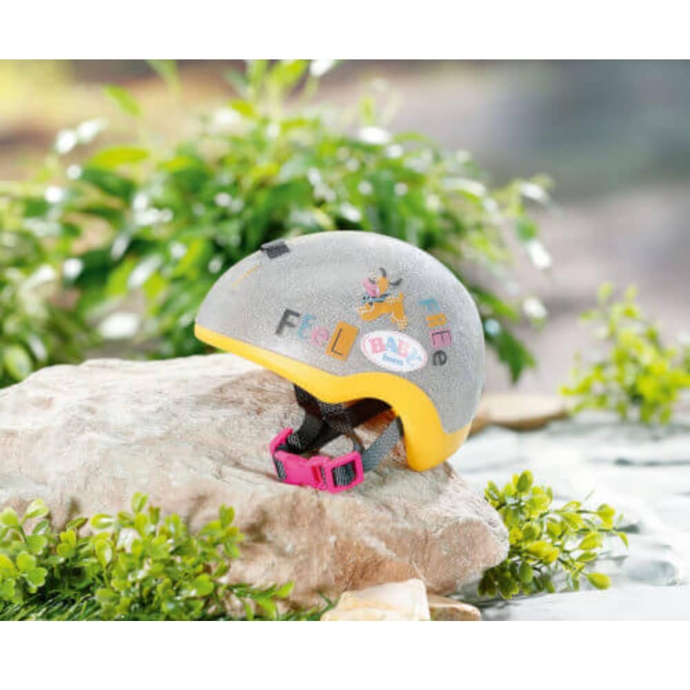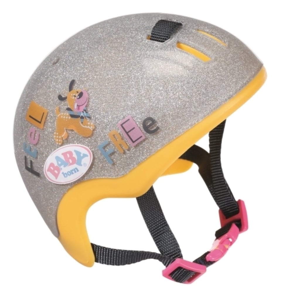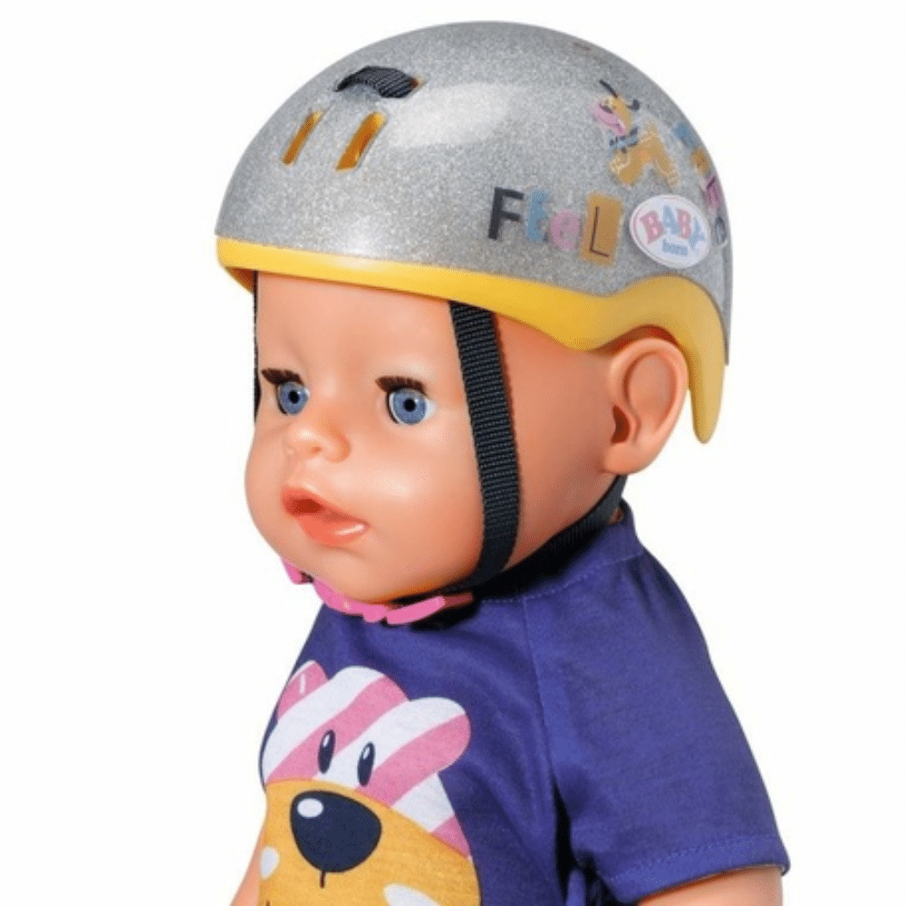Haluaako Baby Born nukkesi lähteä pyöräretkelle? Muista olla turvallinen ja laittaa myös nukelle kypärä päähän. Baby Born pyöräilykypärä on harmaan värinen ja se kimaltelee hienosti. Kypärän reunat ovat keltaiset ja kypärää koristaa hauskat tarrat. Tämä nuken kypärä soveltuu enintään 43 cm kokoisille nukeille. Ei muuta kuin hauskaa pyöräretkeä!