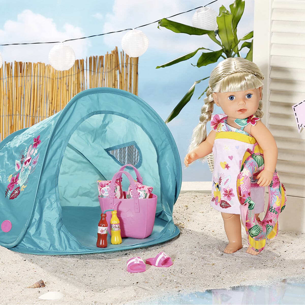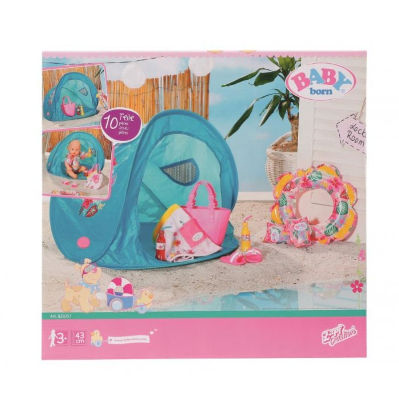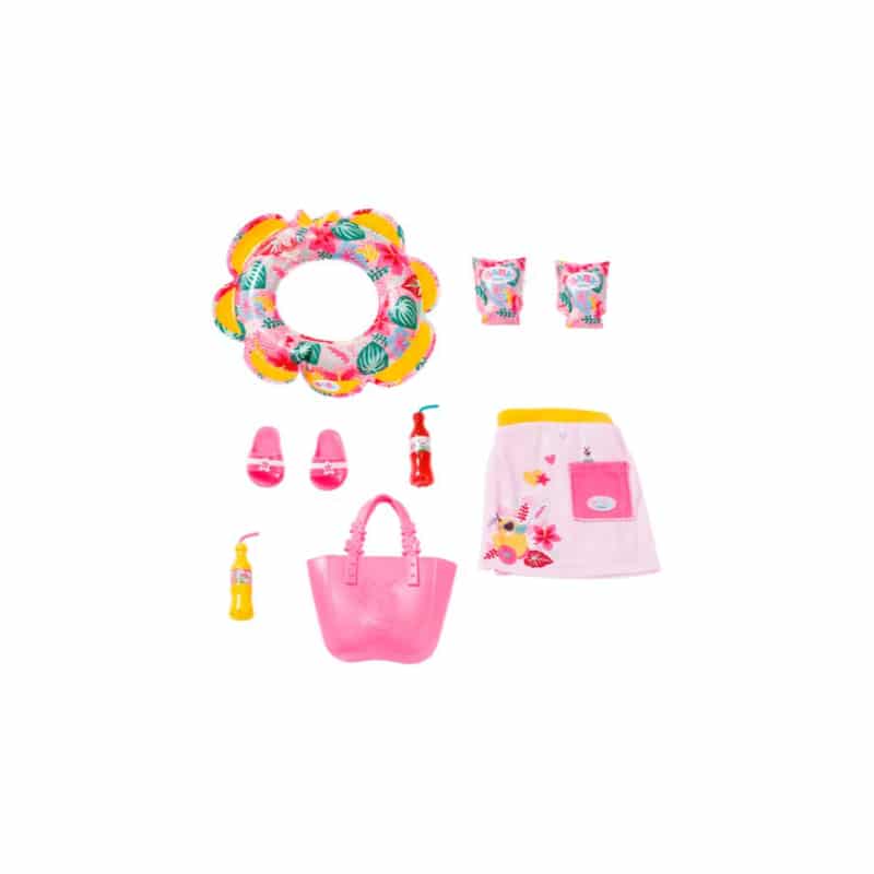 Lähde Baby bornin kanssa rannalle! Pakkaus sisältää 10 osaa: pienen uimarenkaan, uimateltan, laukun, sandaalit, hameen, virvoitusjuomapullot ja uimakellukkeet.