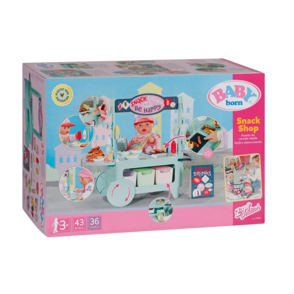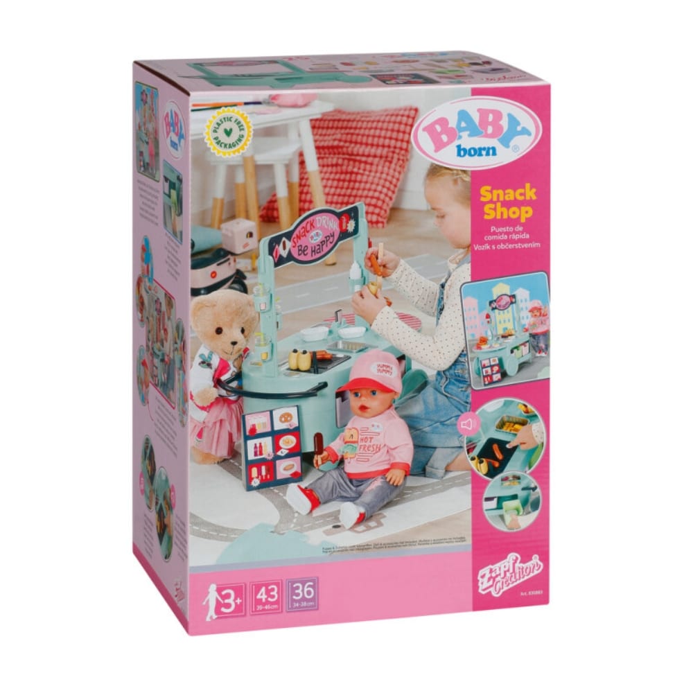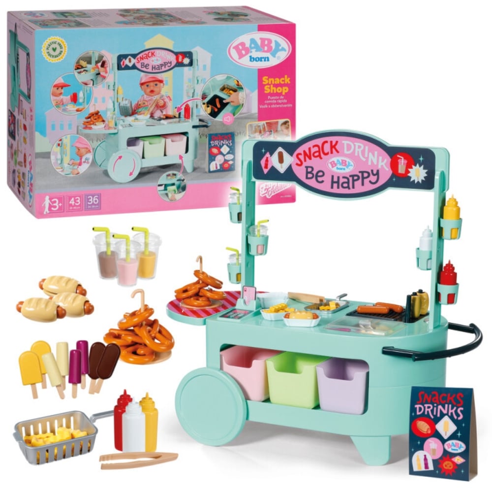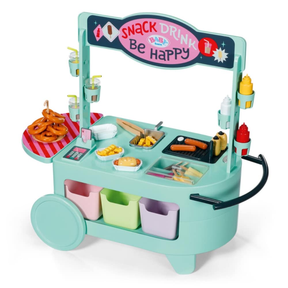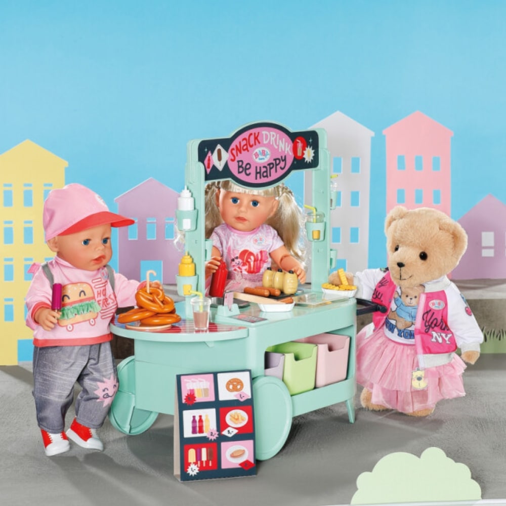 Ruokakärryleikkisetti BABY born nukelle. Grillissä äänitoiminto. Ruokakärryssä on pyörivät pyörät ja sitä voi joko vetää tai työntää kahvasta. Leikkikeittiön ruokatason alla on kuusi ruokakoria.