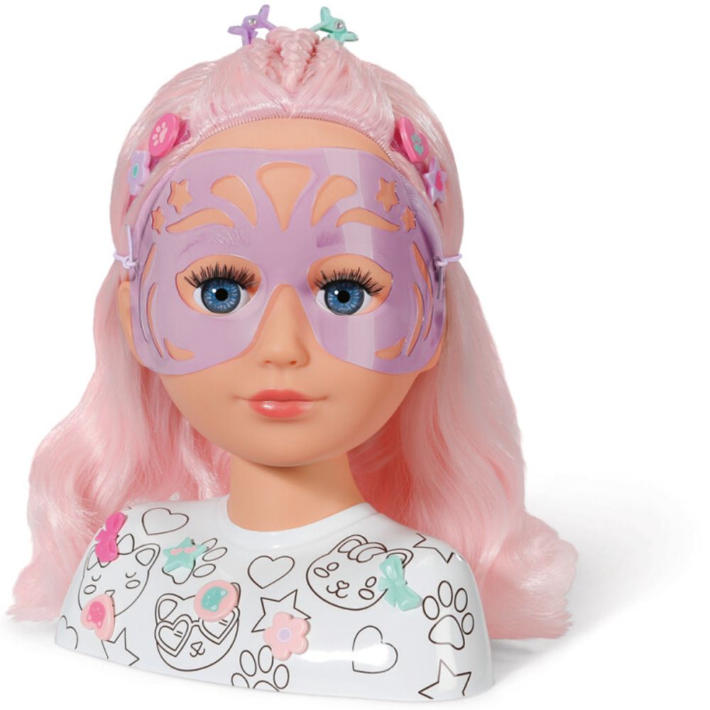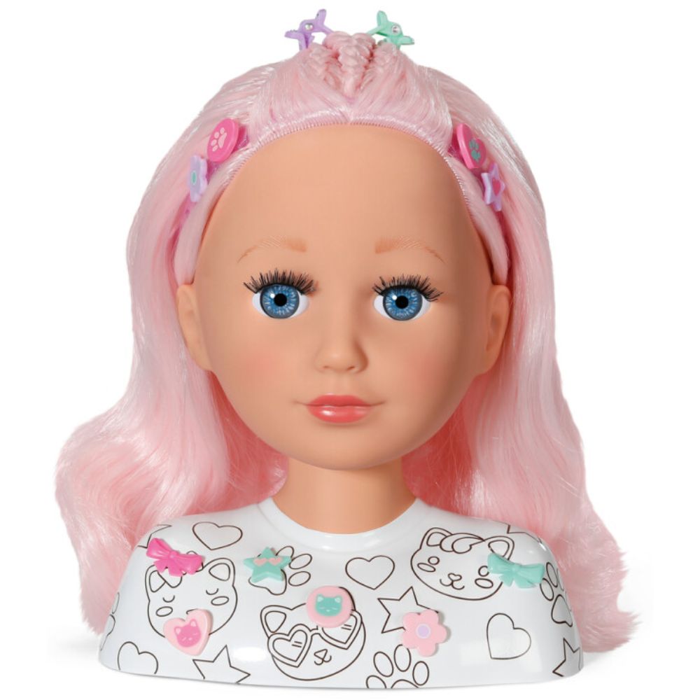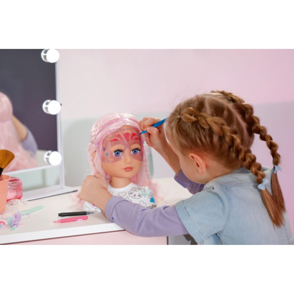 Kauniilla hiuksilla varustettu kampauspää. Voi koristella myös kampauspään kasvoja mukana tulevilla meikkikynillä. Mukana hiustarvikkeita ja meikkisapluuna.
