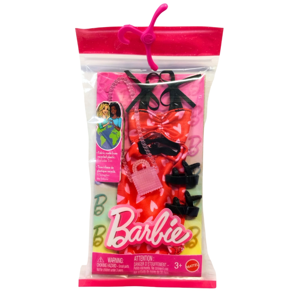 Setin keskiössä on ihastuttava punasävyinen toppi ja hame, joissa on molemmissa upea sydänkuviointi. Vaatteissa on muodikas leikkaus ja näyttävä muotoilu. Lisäksi pakkauksessa on tyylikkäitä asusteita, kuten kengät ja laukku, jotka viimeistelevät Barbien asukokonaisuuden ja antavat lisää vaihtoehtoja pukeutumiseen.