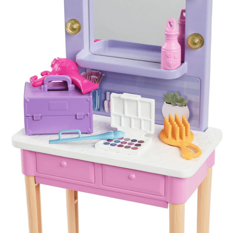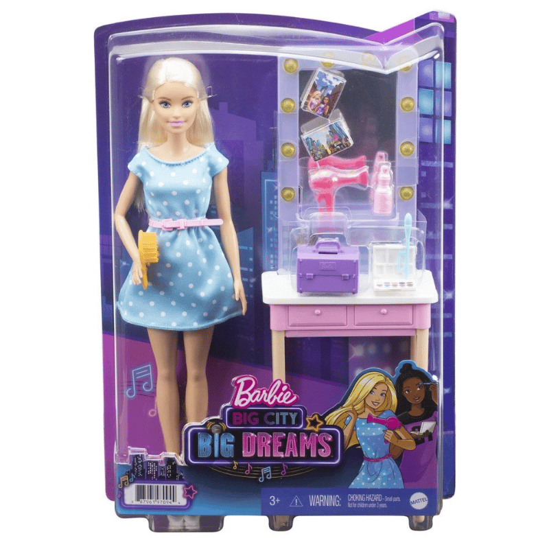 Tämä on Big City Big Dreams -elokuvasta tutun Malibu Barbien takahuonen kampauspöytä. Leikkisetti sisältää Barbie nuken, kampauspöydän, jakkaran sekä tarvikkeita, joilla Barbie loihtii itselleen näyttävän esiintymis-lookin.