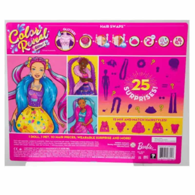 Tämä Barbie® Color Reveal™ sisältää 25 yllätystä! Poista glitterillä peitetty Barbie-nukke hius-spayta muistuttavasta putkesta, täytä putki lämpimällä vedellä, aseta nukke sen sisään ja pyörittele sitä. Lämmin ja jääkylmä vesi vaihtaa Barbien hiuksien ja ihon sekä koiran värin. Tee Barbielle upeita kampauksia mukana tulevilla hiustarvikkeilla ja leiki sillä ja lemmikkikoiralla! Pakkaus sisältää 10 hiustarviketta, Barbie-nuken, koira lemmikin, leikkidiskopallon, jossa on värikkäitä paljetteja sisällä, asusteita ja paljon muuta. Upea lahjaidea!