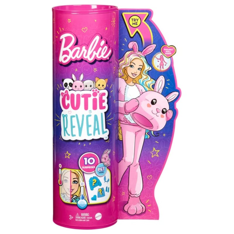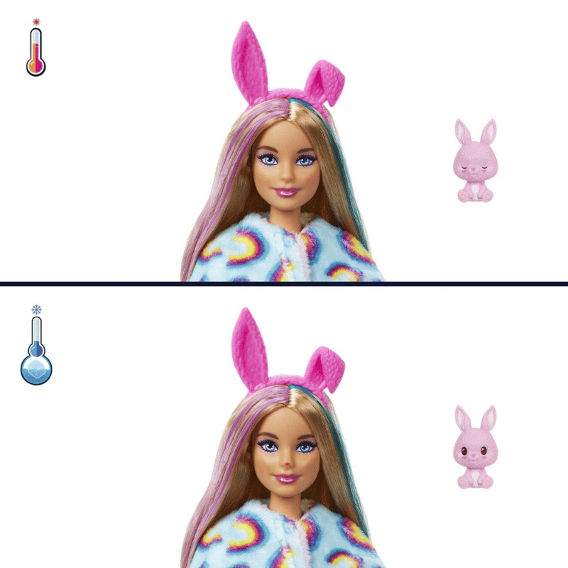 Tässä lelussa tulee mukana 10 yllätystä: Barbie-nukke, asuja, kengät, kampa ja lemmikki. Barbiella on ihana, pehmeä ja vaaleanpunainen pupuasu yllään. Barbie-nukkeen ja pupuun tulee lisää yksityiskohtia, kun laitat ne lämpimästä vedestä kylmään veteen. Nukella tulee söpö punainen pupumainen piste nenän päähän ja pupun silmät avautuvat kylmässä vedessä. Kun taas lämpimässä vedessä ilmeet muuttuvat alkuperäiseksi. Pakkaus on hauskan muotoinen ja voit kokoilla sen päältä aukosta kuinka ihanan pehmeä nuken pupuasu on. Jokaisen pikkutytön unelmalahja!