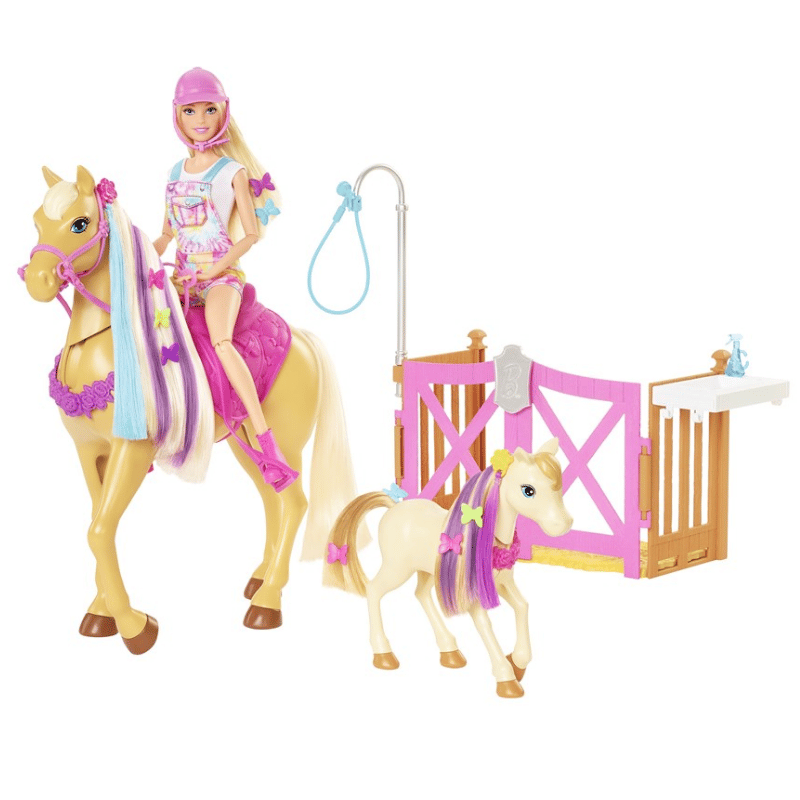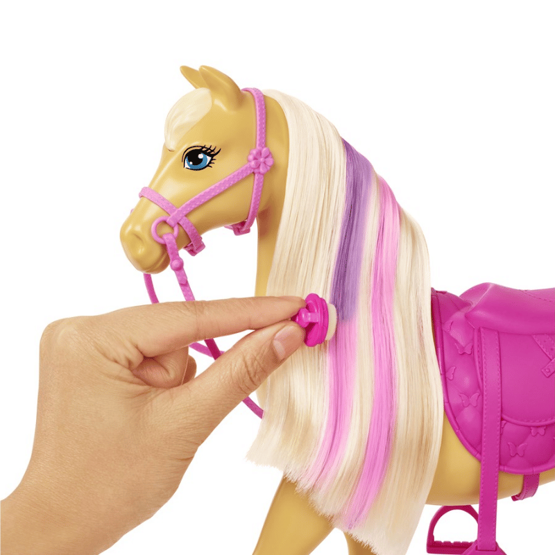 Jokaisen hevosfanin unelmasettiin kuuluu Barbie, hevonen, poni ja yli 20 erilaista hoitovälinettä. Koristele hevosen harja soljilla tai kastele kylmällä vedellä, niin se muuttaa väriä. Ratsastuslenkin jälkeen hevosille maistuu herkkuporkkanat.