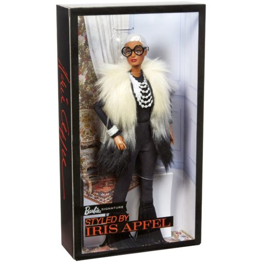 Iris Apfel on ikinuori tyyli-ikoni, jonka tyylissä näkyy iloinen elämänasenne. Tyylikkäällä Barbie-nukella on yllään näyttävä housupuku, upeat asusteet ja Apfelin tavaramerkki: paksusankaiset silmälasit.