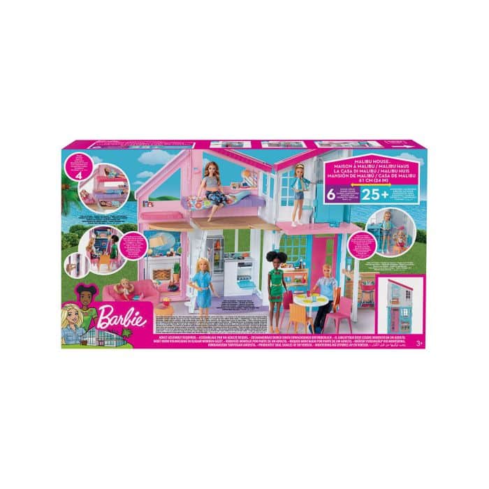 Barbie talo Malibu – Barbien tyylikäs kaupunkikoti on muunneltavissa tilanteen mukaan. Olohuoneesta tulee kotiteatteri, keittiöstä smoothie-baari ja kerrossängyihin mahtuu vieraita. Liikkuvat osat ja monipuoliset tarvikkeet innostavat hauskaan kotileikkiin.