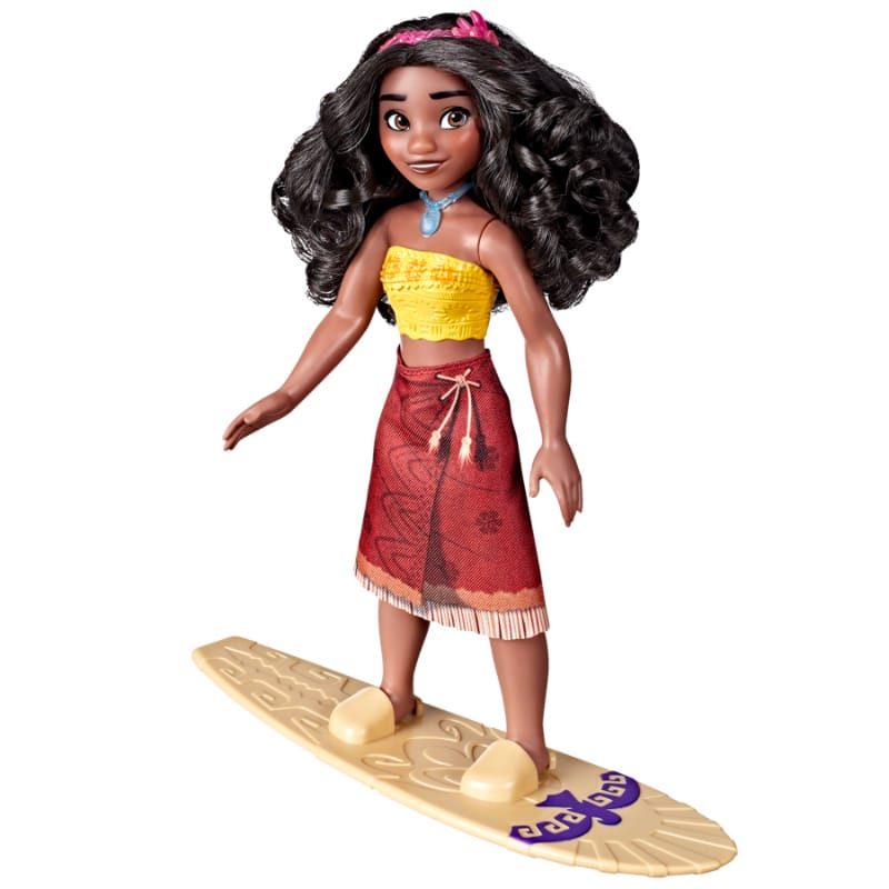 Maanläheinen Disney prinsessa Vaiana on valmis arkipäivän seikkailuihin ja rakastaa surffaamista! Vaiana-nukella on pitkät, taipuisat ja mustat hiukset, joita koristaa kukkapanta. Päällään sillä on kankainen irrotettava hame, kiinninnäinen napapaita ja kaulakoru. Laita Vaiana seisomaan sen surffilaudelle ja tee sen kanssa hienoja temppuja isoissa aalloissa. Surffilaudan kotkakuvio vaihtaa väriä liilasta siniseksi lämpimässä vedessä. Nuken pää ja jalat ovat nivelletyt ja sen korkeus noin 24 cm. Ikäsuositus: 3+ vuotta.
