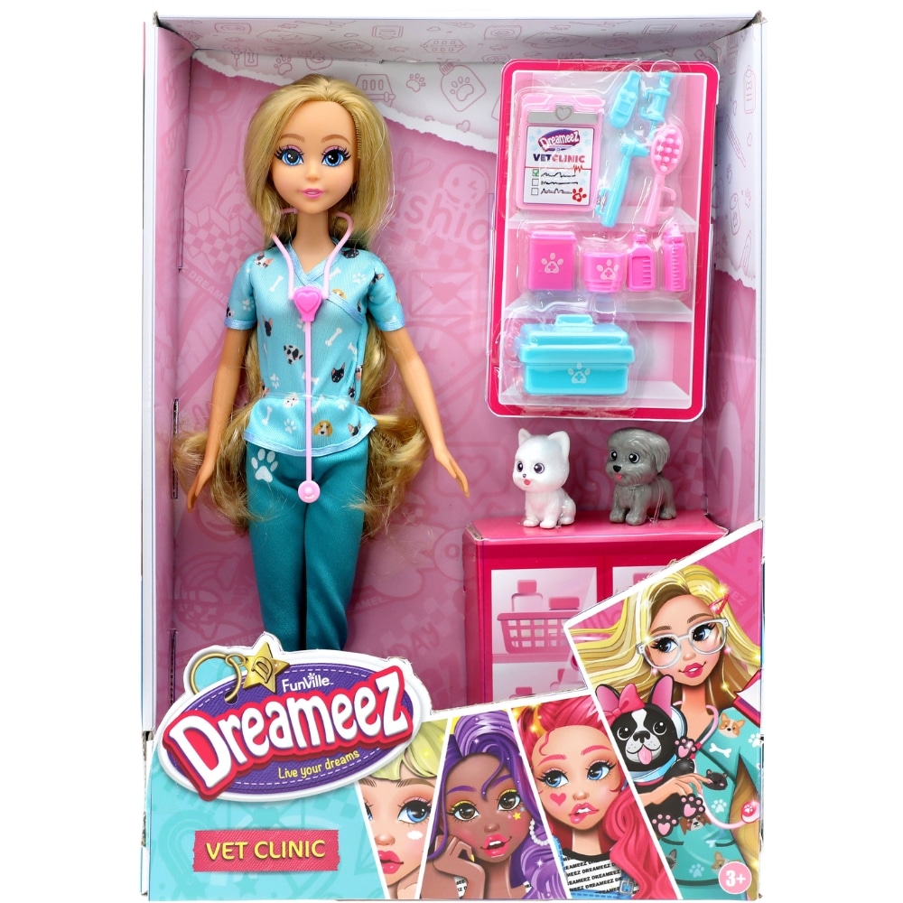 Dreameez-eläinlääkärinukke hoitaa kipeät lemmikit kuntoon hellästi ja ammattitaitoisesti. Leikkisetti sisältää nuken, kaksi lemmikkiä ja lääkärin tarvikkeita.
