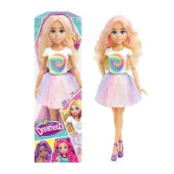 Dreameez-muotinukke on 70 cm pituinen, joten se sopii niin leikkiin kuin lastenhuoneen koristeeksi! Nukella on yllään raikas t-paita, kimalteleva hame ja näyttävät korvakorut. Vaaleahiuksisella nukella on hiuksissa hienot pinkit raidat.