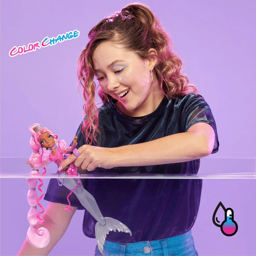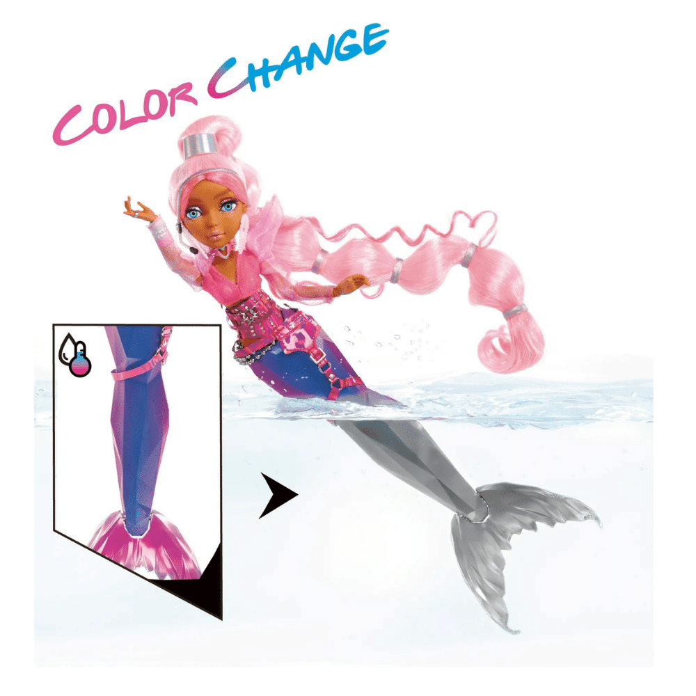 - Mukana tulee: väriä vaihtava merenneitonukke, sille sopia vaatteita, koruja ja kassi.