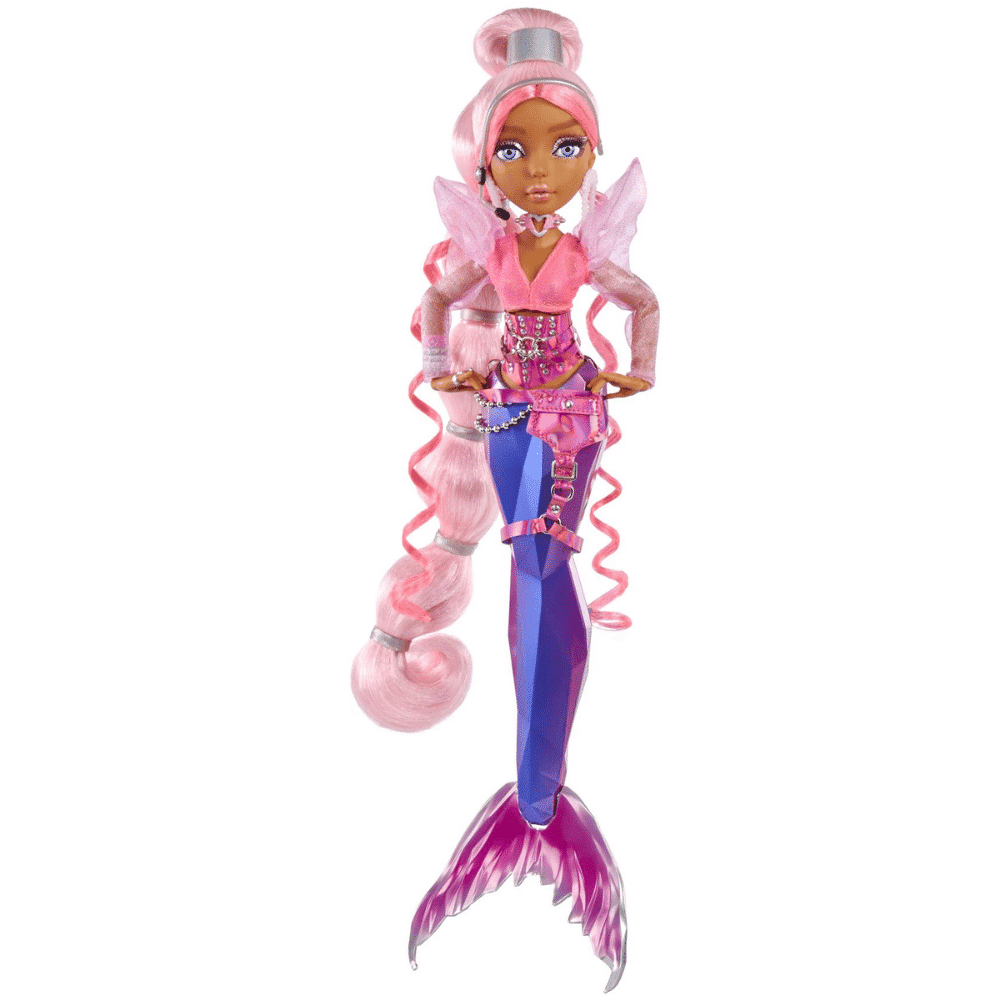 Lumoavat merenalaiset luovat leikit voivat alkaa nyt tällä upealla uutuus Mermaze Merenneito Harmonique-muotinukella! Mermaze merenneito Harmoniquella on huikean pitkät pinkit hiukset, lasisilmät, pitkät ripset ja liikkuva evä. Uudistuneen nuken pyrstö vaihtaa väriä vedessä. Merenneidon pyrstön evä toimii jalustana.