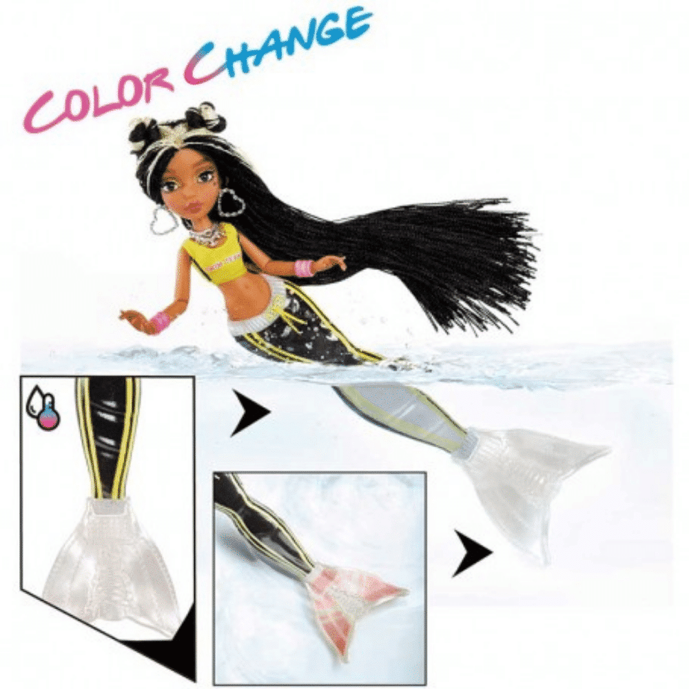 - Mukana tulee: väriä vaihtava merenneitonukke, sille sopia vaatteita, koruja ja kassi.