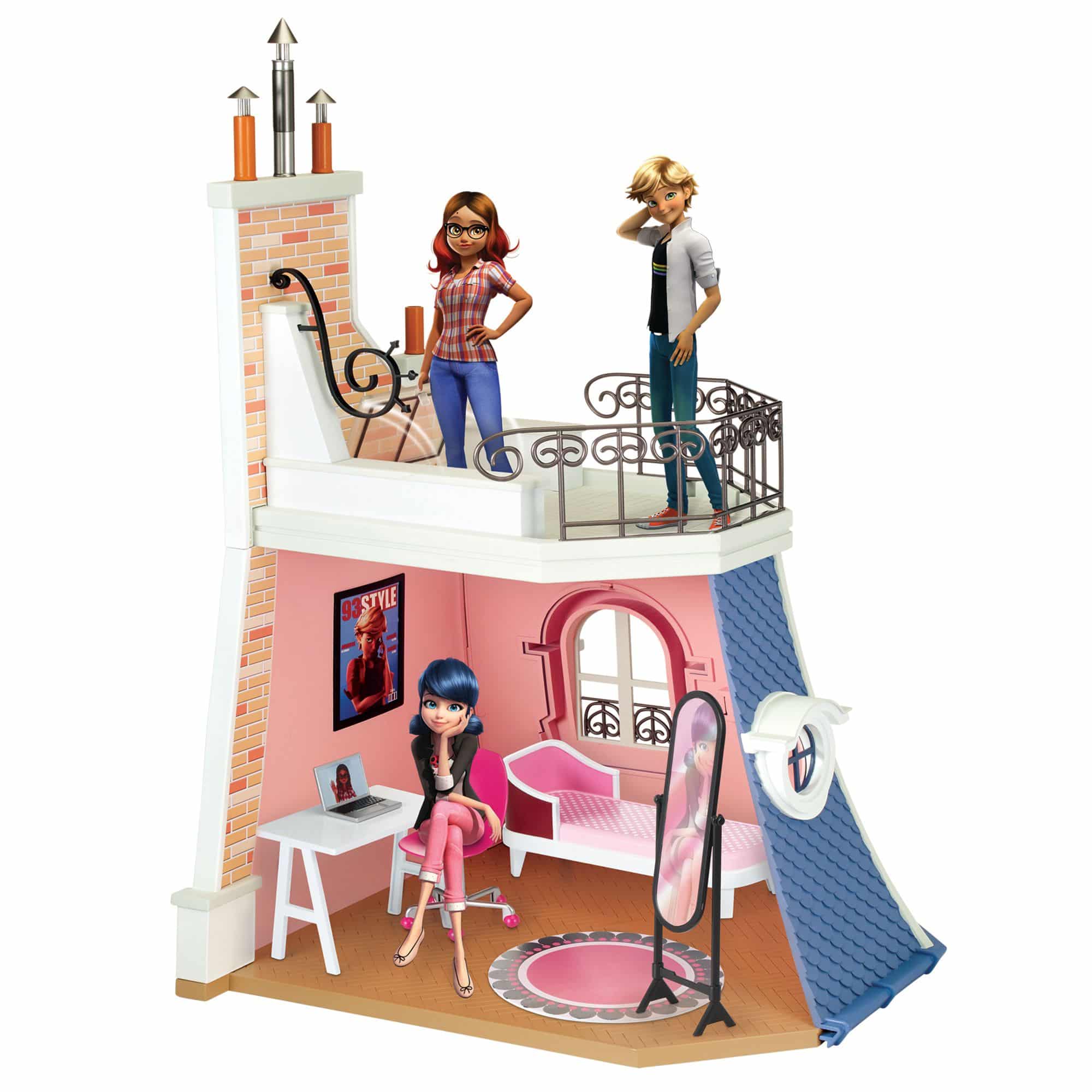 Miraculous 2-in-1 Makuuhuone ja parveke -leikkisetti sisältää upeita yksityiskohtia. 63 cm korkeassa leikkisetissä riittää leikittävää ja hauskoja ominaisuuksia. Marinetten huoneesta löytyy muun muassa salainen luukku, joka paljastaa pääsyn upealle parvekkeelle. Katolta avautuu upeat maisemat Pariisin kaduille! Elä Miraculous -sarjan suosikkikohtaukset uusiksi ja luo uusia juonenkäänteitä! Leikkisetissä mukana kuusi erilaista tarviketta: Marinetten työpöytä, tuoli, kannettava tietokone, tyylikäs lepotuoli, kääntyvä peili ja pyöreä matto.